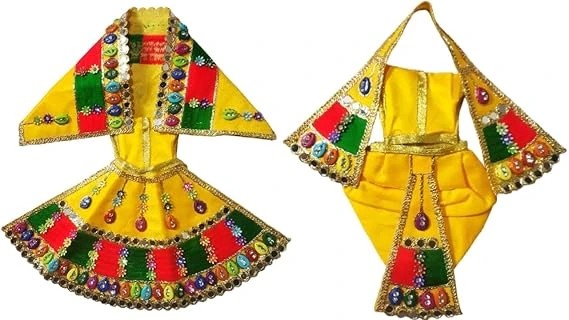 Radha-Krishna Matching Dresses, (Size 2 for 4 inch murti) Made of Silk Cloth, Embellished with Sequins & Stones, Pack of 2 Poshaks (1 Krishna, 1 Radha Dress), Color-Yellow