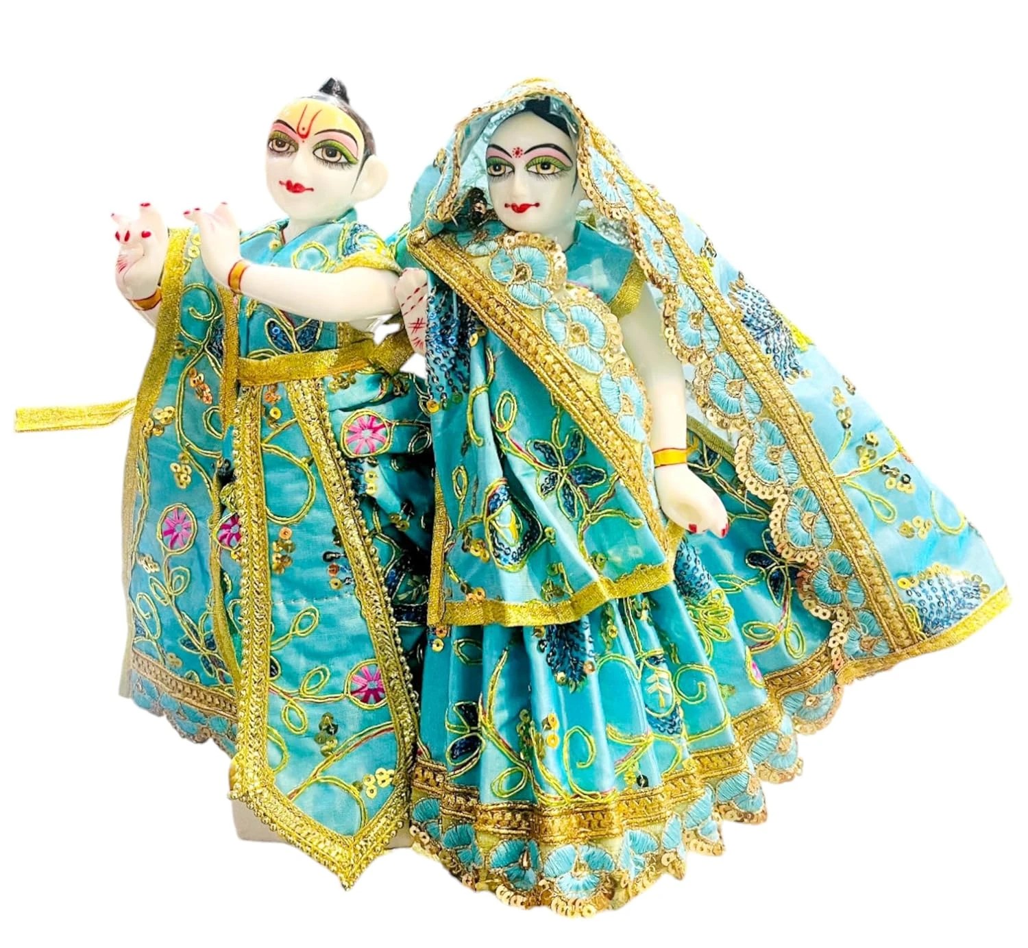 Our Radha Krishan Jodi Poshak Silk Shine Dress is a set of six elegantly crafted garments, perfect for celebrating the divine union of Radha and Krishna during Diwali Puja. It includes Patka, Dhoti, and Choli for Krishna, and Lehenga, Chunri, and Choli for Radha, each adorned with intricate designs and silk shine fabric.