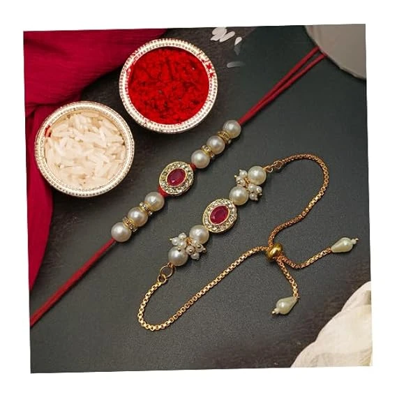 Rakhi Combo Set for Brother and Bhabhi Premium Lumba Floral Rakhi Kundan Bracelet for Bhaiya Men Bhabhi Women Raksha Bandhan Couple Pearl Set of 2 for Unisex Adult