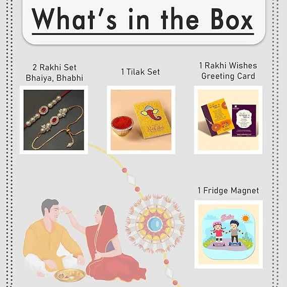 1. Rakhi Combo Package Content (5 Items): 2 Premium Rakhis (1 Premium Designer Green Rakhi for Brother Bhaiya, 1 Premium Green Rakhi for Bhabhi), 1 Fridge Magnet for Door Decor, 1 Best Wishes Greeting Card