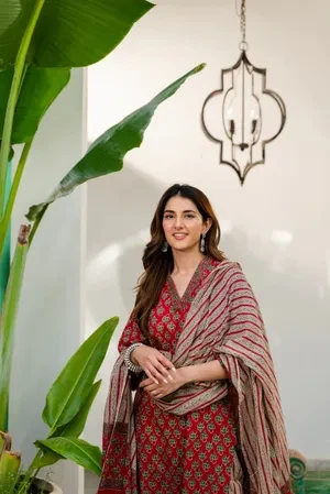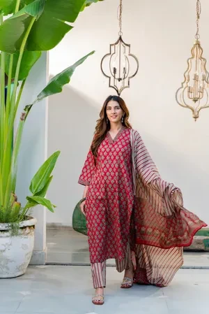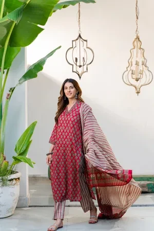 Red Rayon Slub & Dupatta Kotachex Kurta Set For Women