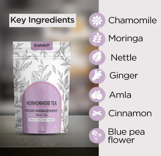PRODUCT – sehatUP HORMONIHERB PCOS PCOD Women Health Tea with the right blend of Chamomile, Nettle, Moringa, Amla, Ginger, Fennel, Peppermint, Celery, Shankhpushpi, Punarnava, Manjishtha, Blue Pea Flower, Shatavari, Cardamom, Cinnamon and other Ayurvedic Herbs 100% Natural: Contains all natural ingredients & is chemical-free.