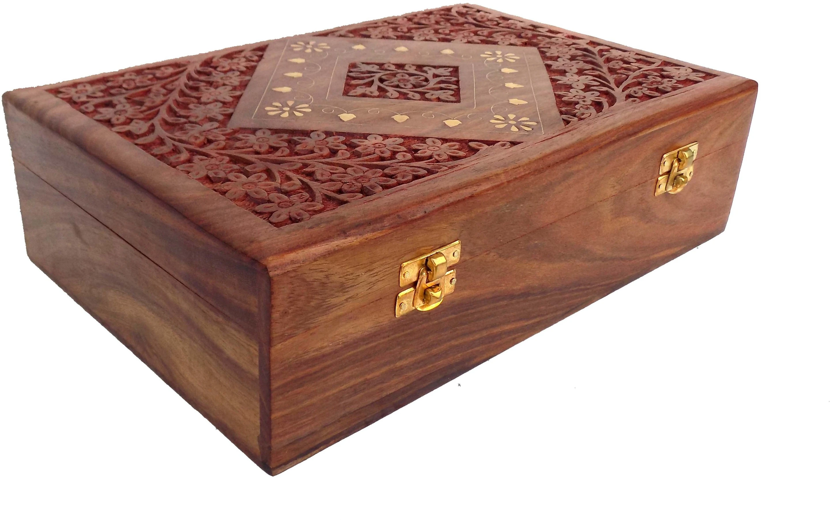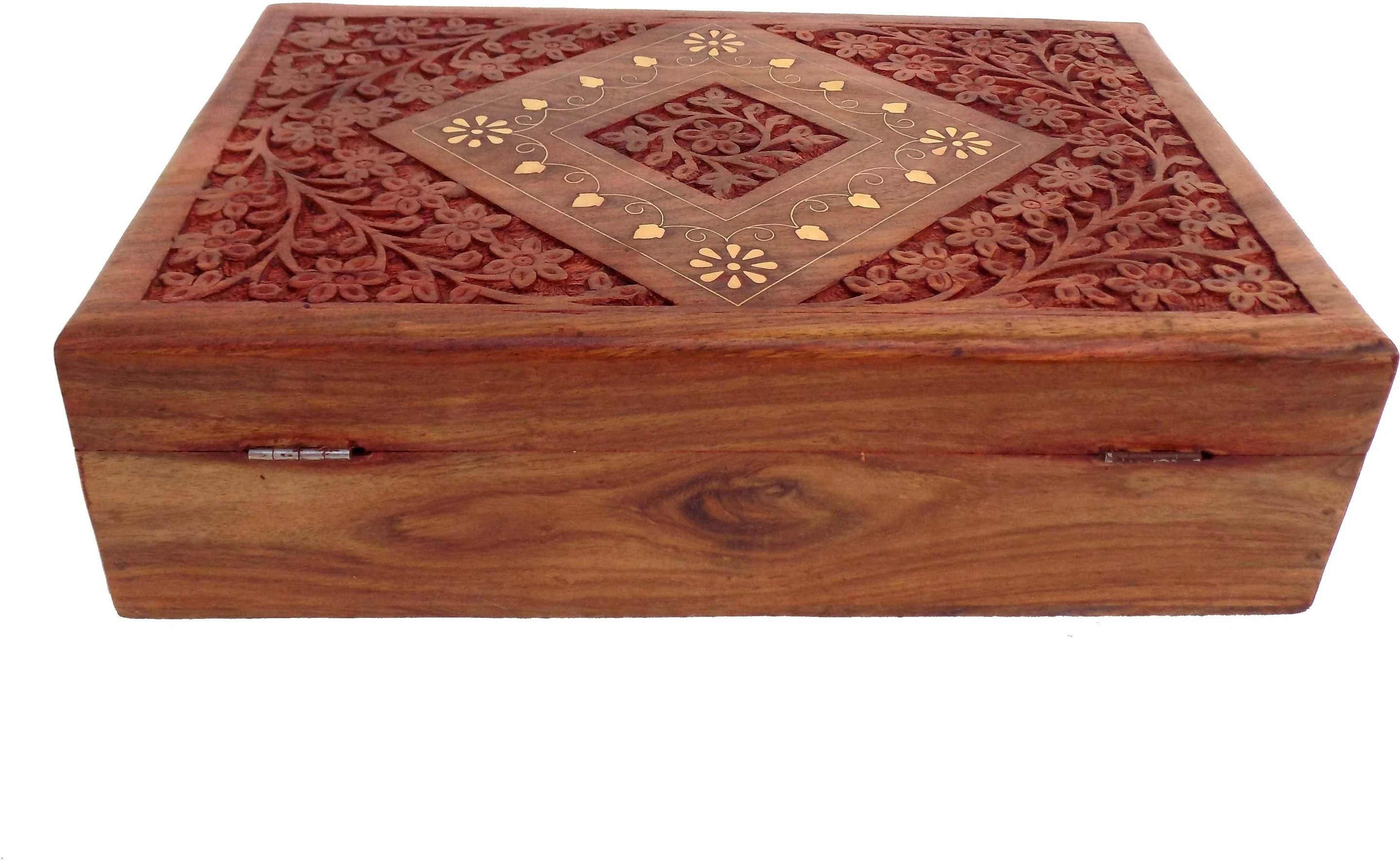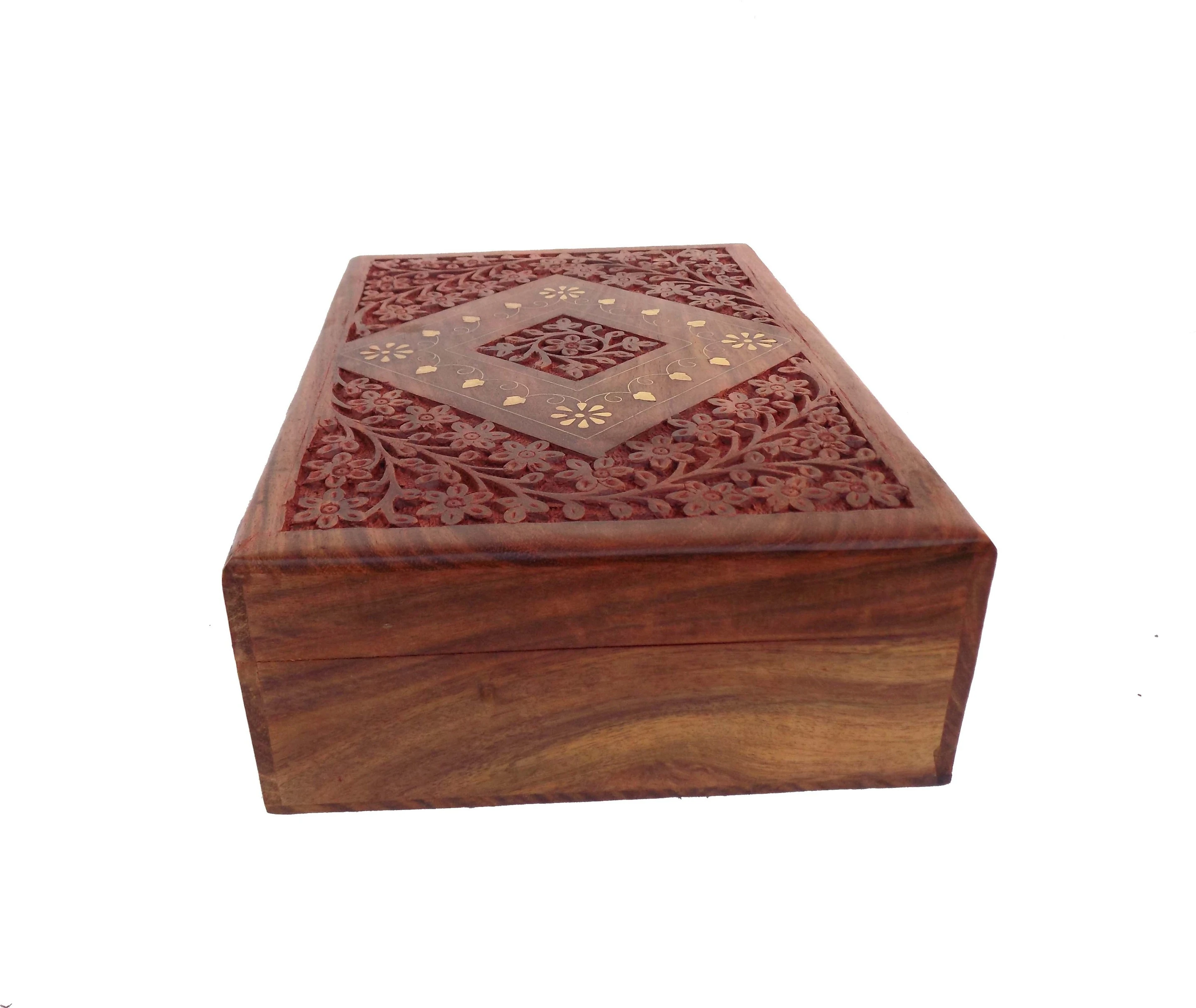 ALL IN ONE SHOP PRESENT A THICK SHEESHAM WOOD MADE WELL CARVED AND BRASS INLAY WORK DONE JEWELLERY BOX IT IS HANDCRAFTED AND ONE OF THE FINE CRAFTSHIP OF OUR YOU CAN USE IT AS A JEWELLERY BOX,MAKEUP BOX OR OTHER UTENSIL NOTE- 1 COLOUR OF THE EACH PRODUCT IS DARK OR LITE DUE TO NATURE OF WOOD