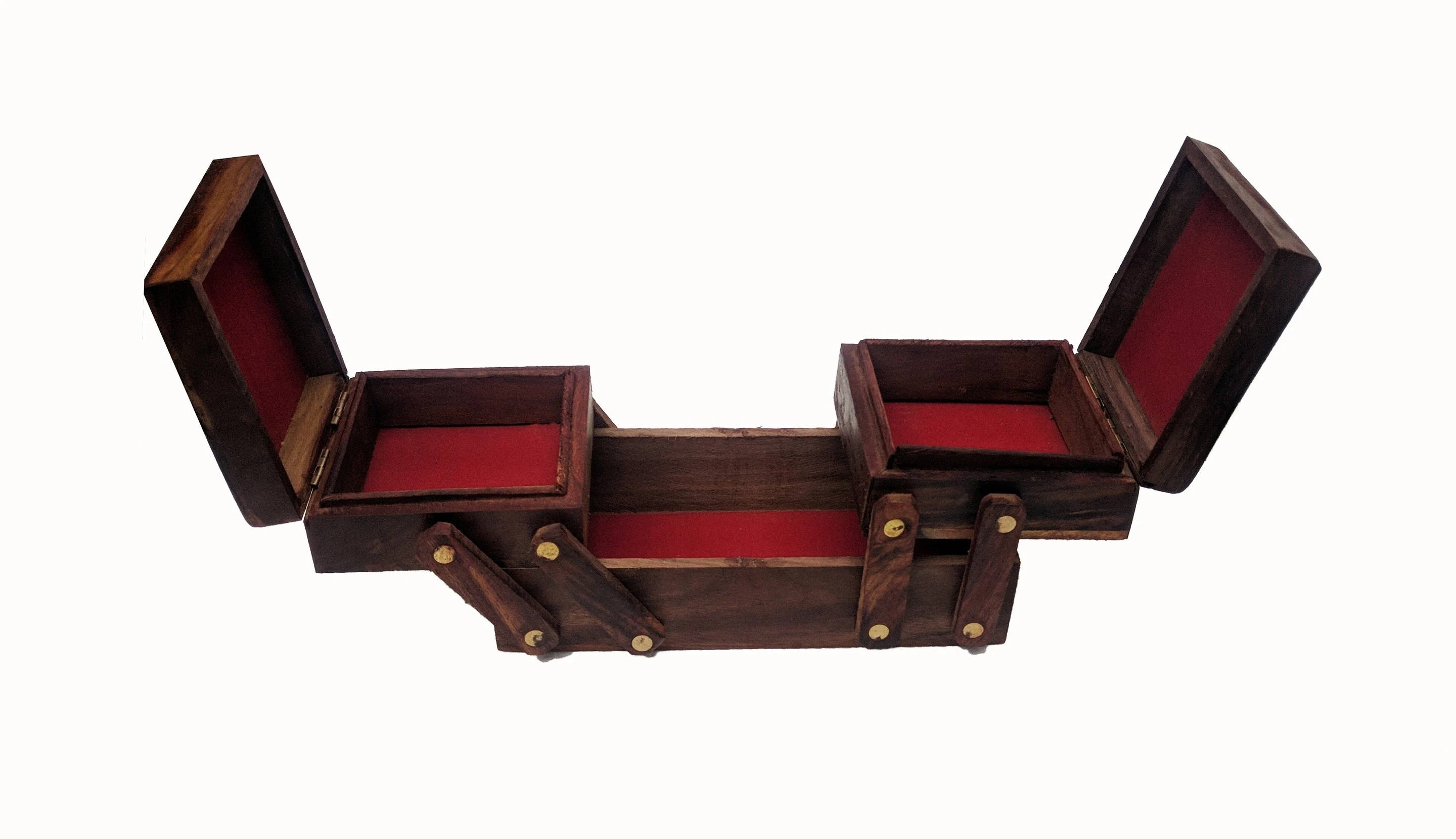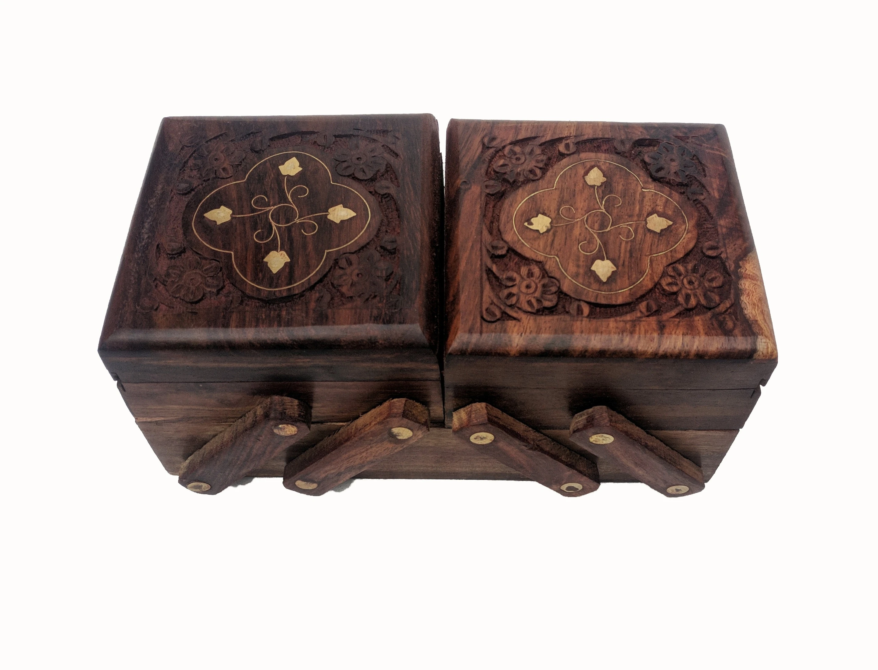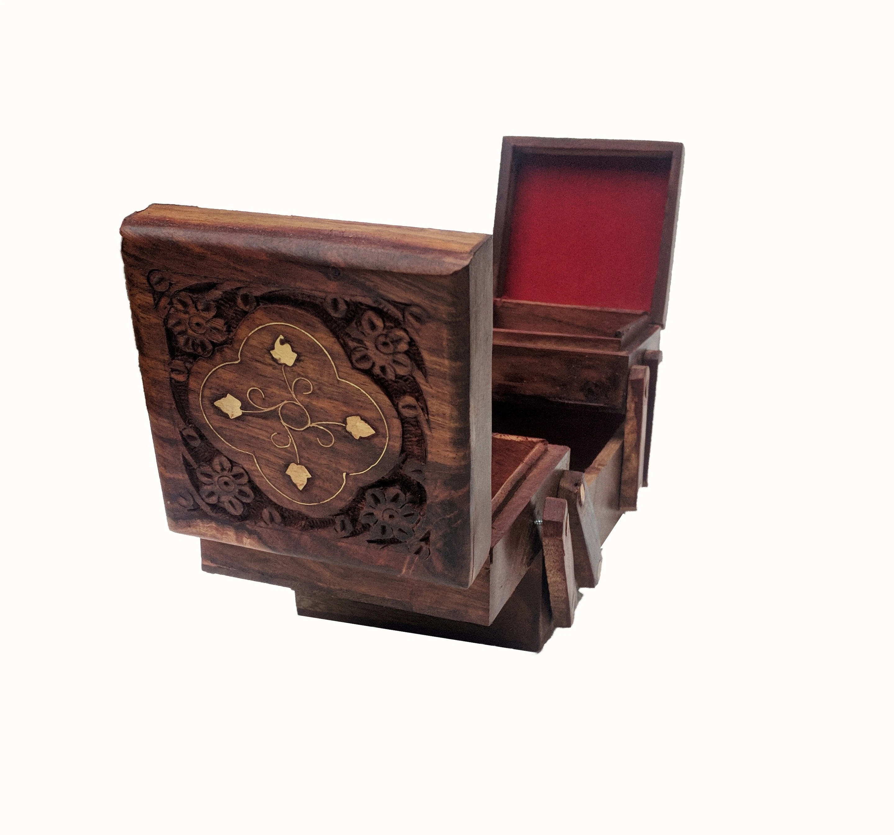 Sheesham Wood BRASS Made WELL CARVED Jewellery Box In Attractive Look & There Is 3 Compartment In It.