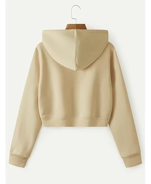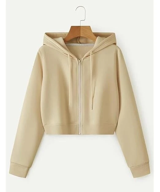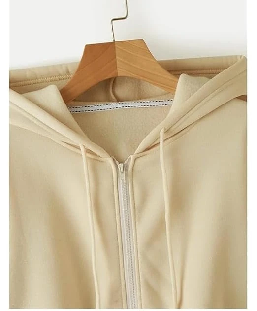 Soft Fleece Solid Long Sleeve Drawstring Crop Zipper Jacket Hooded Full Zip Up Sweatshirt for Women's Girl's Winter Wear Crop Hoodie | Color Beige