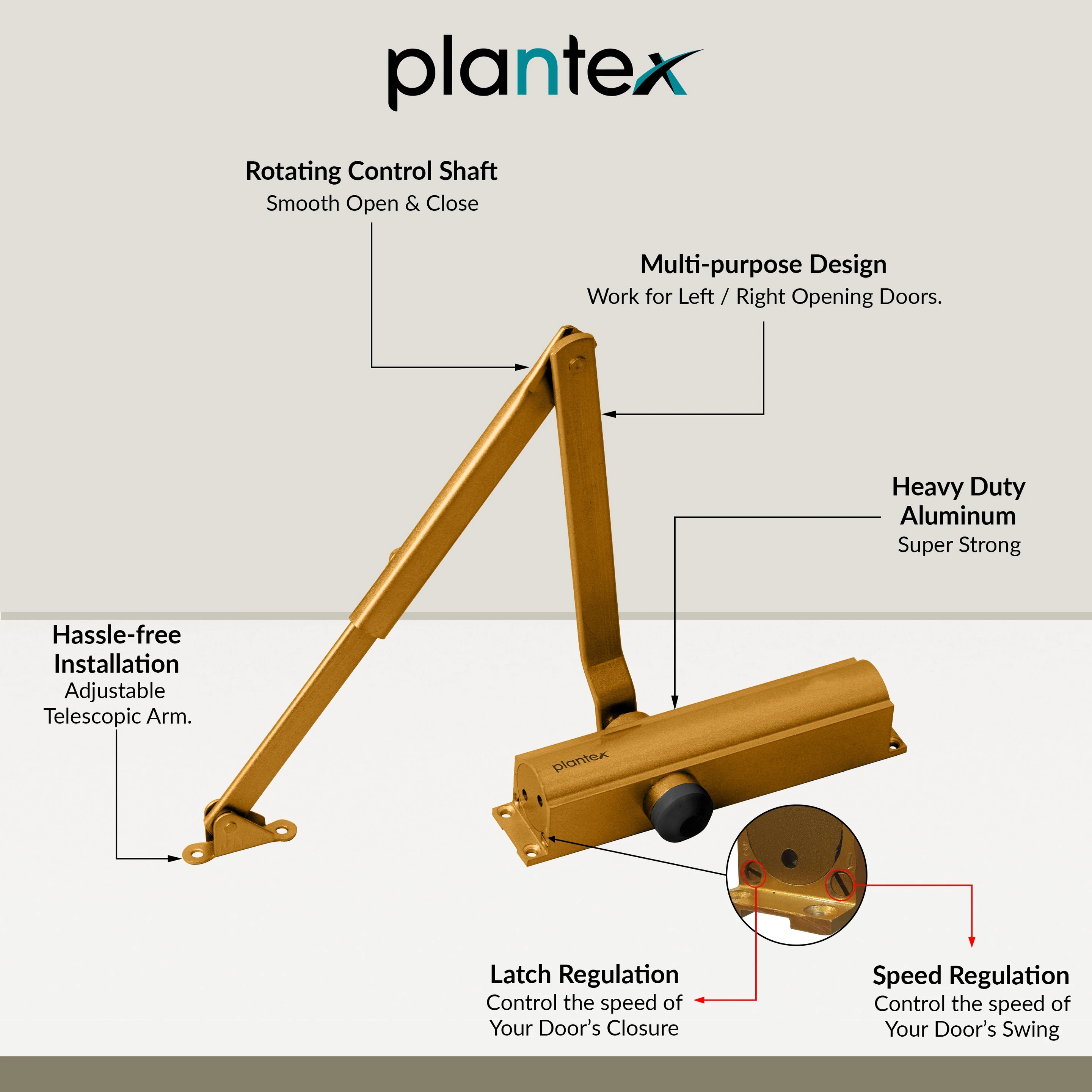 Technical Details:- Mechanism Body Size 16.5 cm. Close open Arm size 19 cm.Certified:- Plantex Hydraulic Door Closer are ISO 9001 certified. This door closer is also internationally certified Plantex: "Fix & Forget".Features:- Compact Design and standard Mechanism are in accordance. Plantex door closer open at 180 degrees. It can support a door that weighs up to 70 kg. Build Quality:- This Door Closer is made in aluminum extrusion body. Metallic paint for an excellent and long-lasting finish. 6 Lack cycles are tested and approved. Advantages:- Reversible (Left or Right-hand operating door fixing). It runs quietly and smoothly and makes no noise when in use. Simple to adjust arms This door closer has two-speed settings that are adjustable.