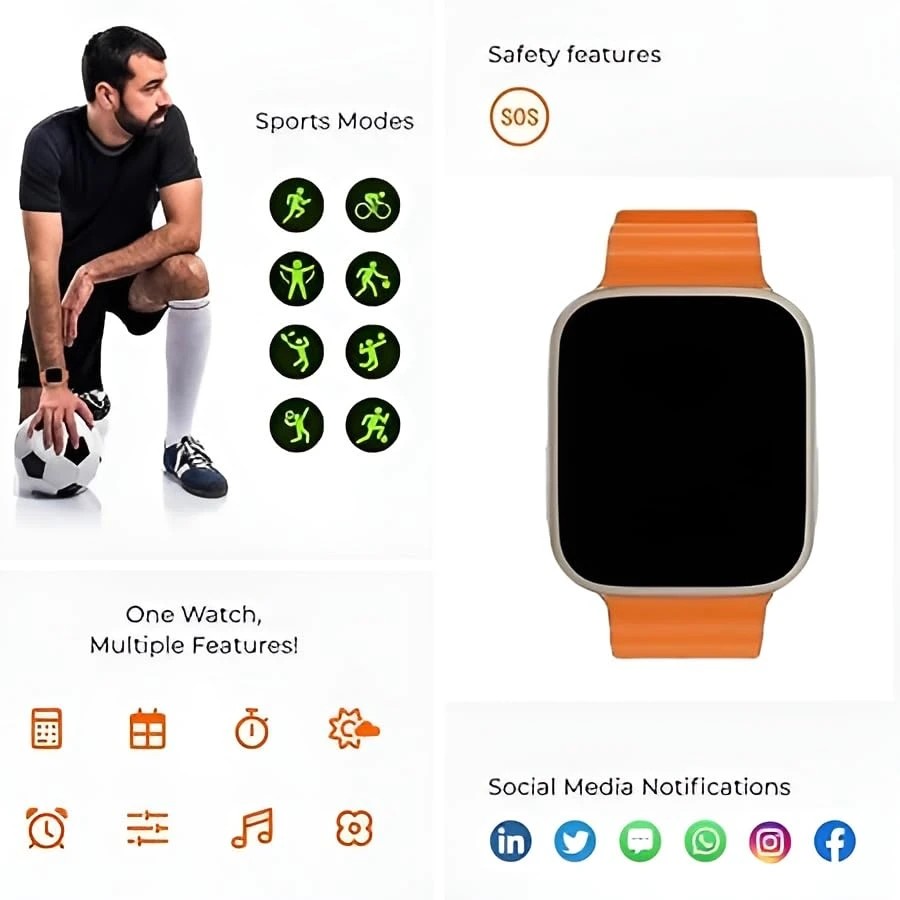 Elevate your digital lifestyle with the T800 Ultra smartwatch, featuring a stunning 1.99-inch HD touch display that brings clarity to every interaction. The vibrant orange strap adds a stylish accent while ensuring comfortable all-day wear. This sophisticated timepiece offers comprehensive health monitoring capabilities, including heart rate tracking, blood oxygen (SpO2) measurement, and sleep pattern analysis.