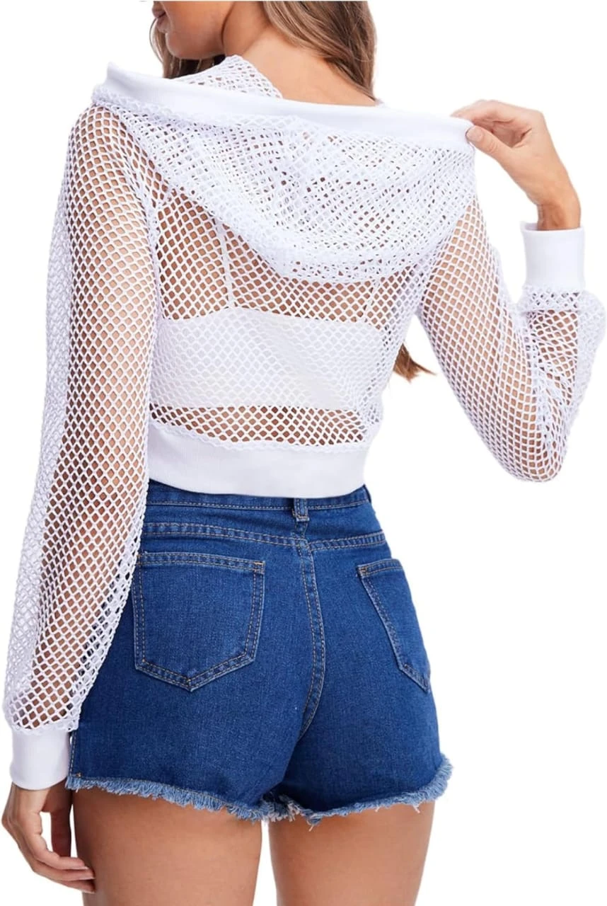 TALITHA FASHION Women's Mesh Fishnet Crop Hoodie – Trendy See-Through Summer Net Top – Stylish Drawstring Pullover Sweatshirt for Casual