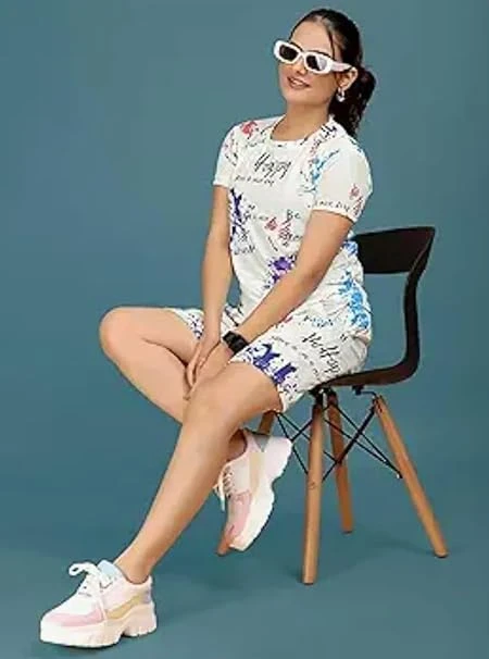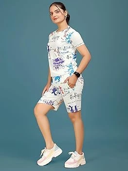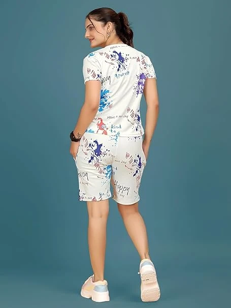 Talitha Fashion Women’s Cotton Half Pajama Set with Top & Pants Lycra Printed & Knitted Round Neck Nightwear Sets | Short Sleeve Nightsuite for Women and Girls Nightdress Color White