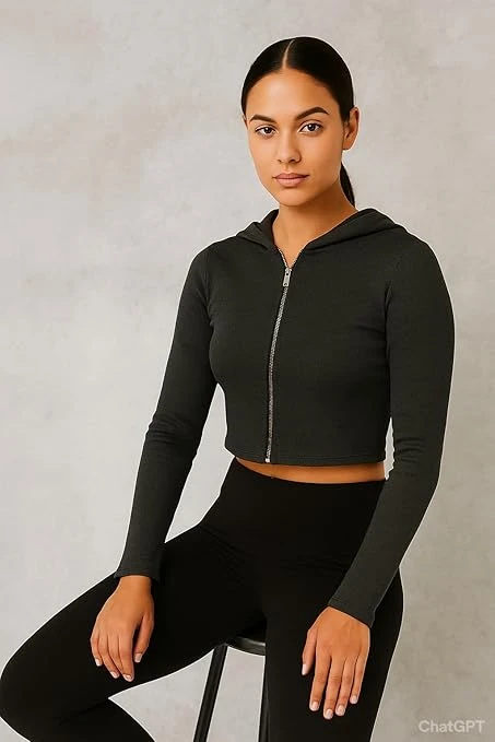 • Cropped zip-up hoodie featuring a sleek full-length zipper closure and modern minimalist aesthetic