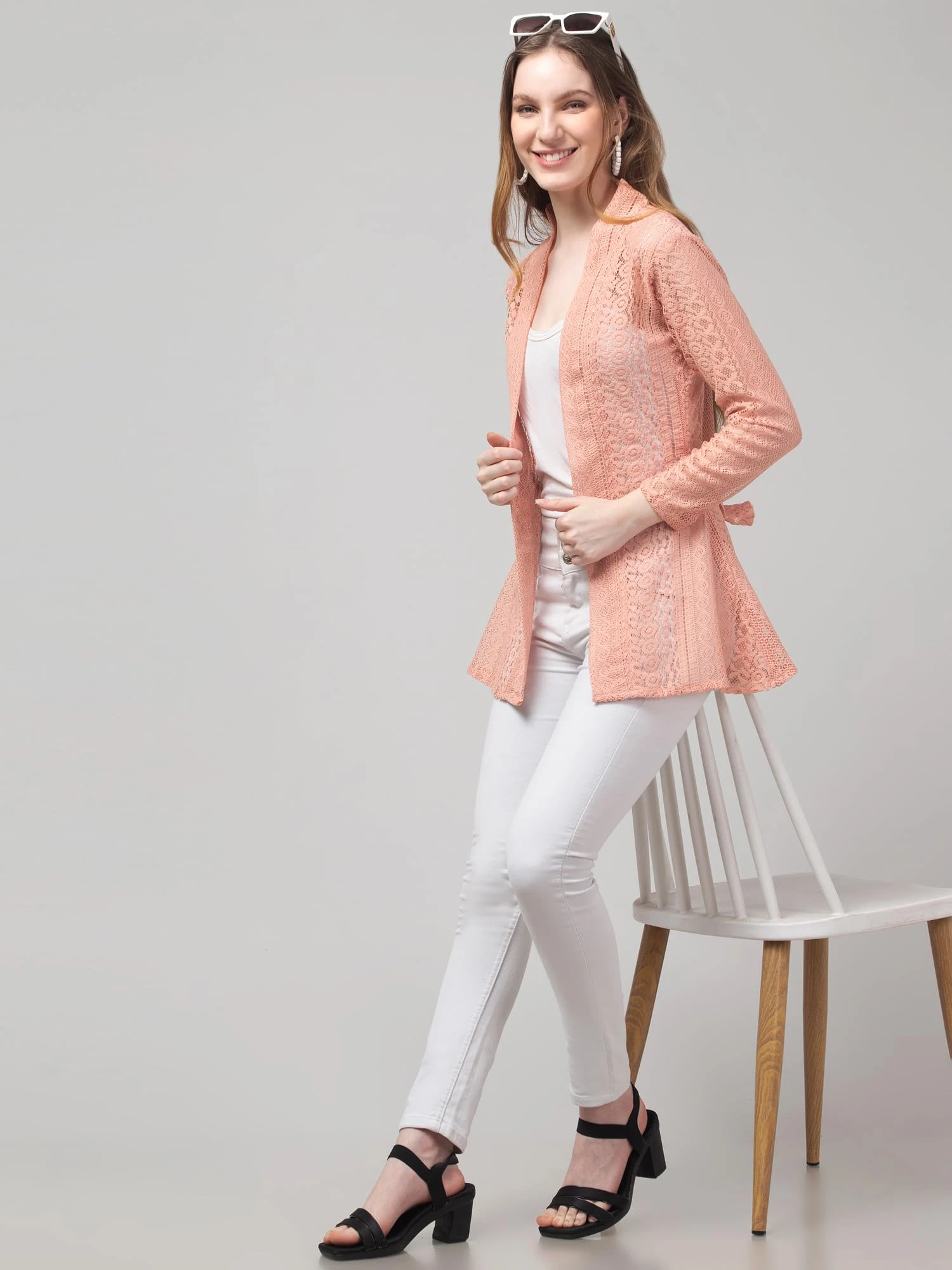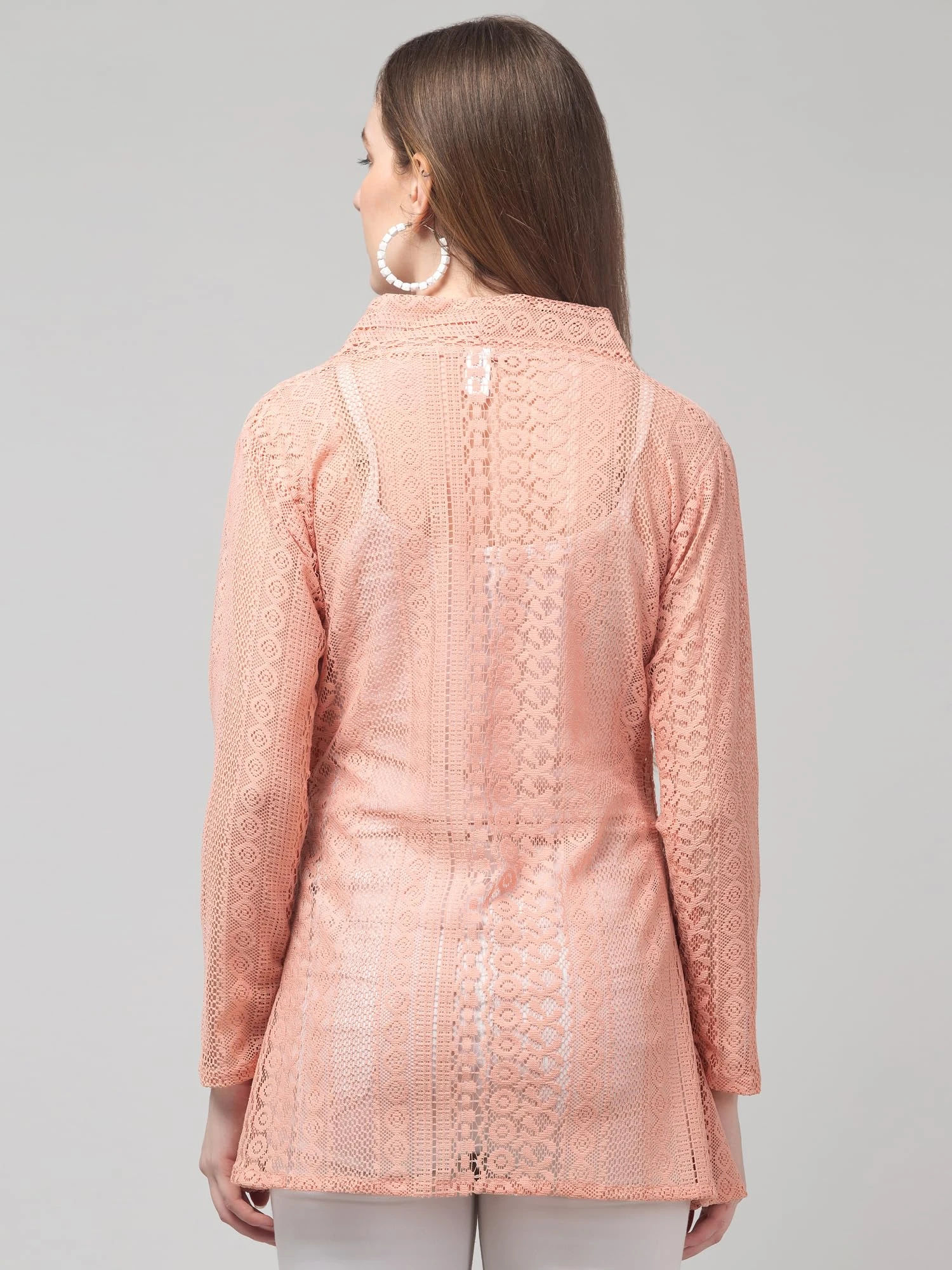 Talitha Fashion Women's Lace Shrug - Long Sleeve Regualar Open Front, Sheer Mesh Cover Summer Wear Full sleeves Jacket Style For Jeans (IN, Alpha, XL, Regular, Peach)