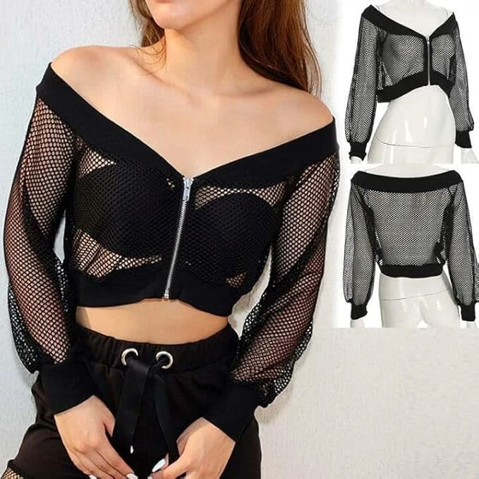 Elevate your fashion game with this TALITHA FASHION Women’s Mesh Crop Jacket, featuring a sexy off-shoulder design with a sheer, see-through mesh fabric for a bold, modern look.