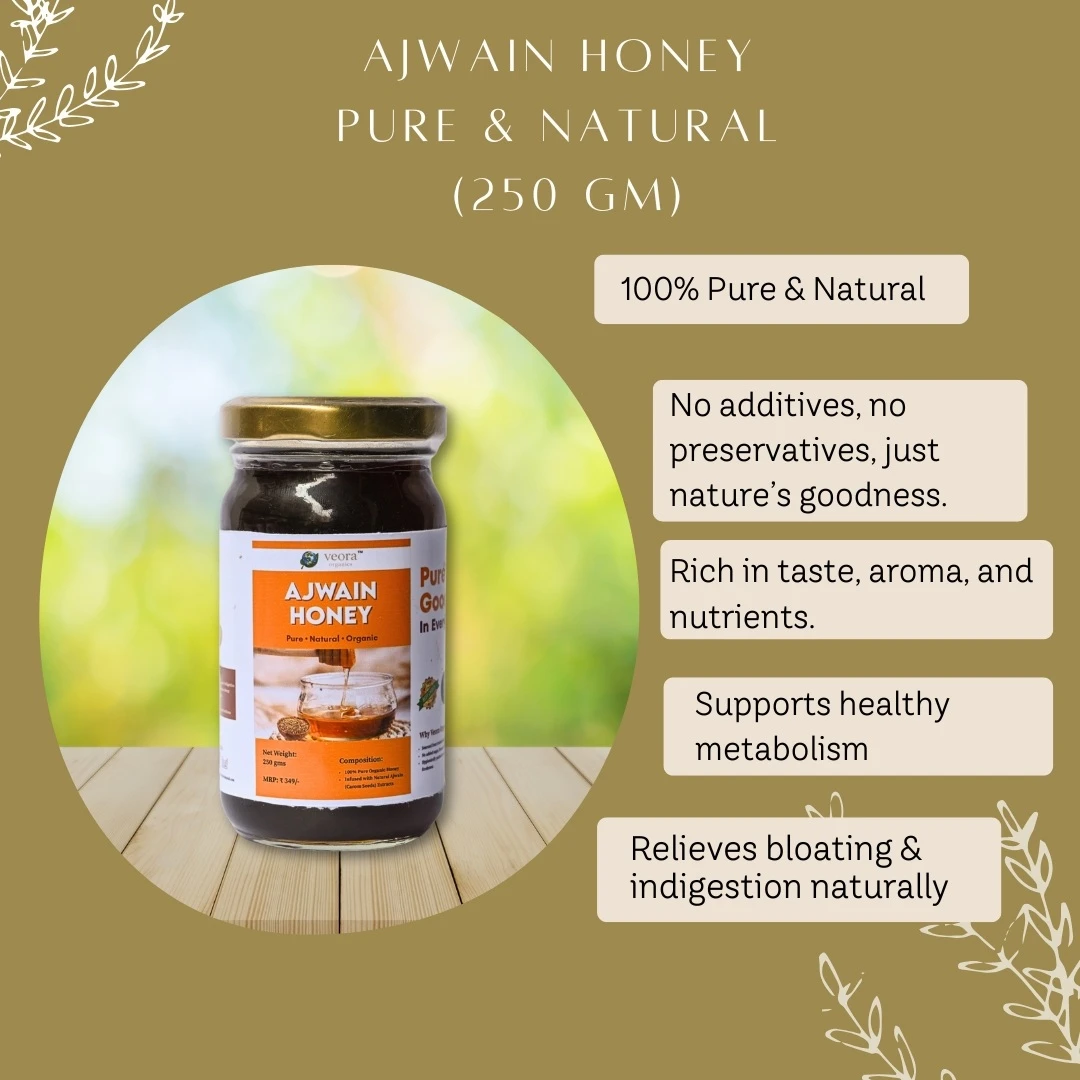 Discover the natural wellness of Veora Organics Ajwain Honey pure and natural 250 gms, a unique variety made from the nectar of Ajwain (Carom) flowers. Known for its medicinal properties, Ajwain Honey is 100% pure, organic, chemical-free, and harvested directly from nature to preserve its rich nutrients and flavor. No Added sugar.