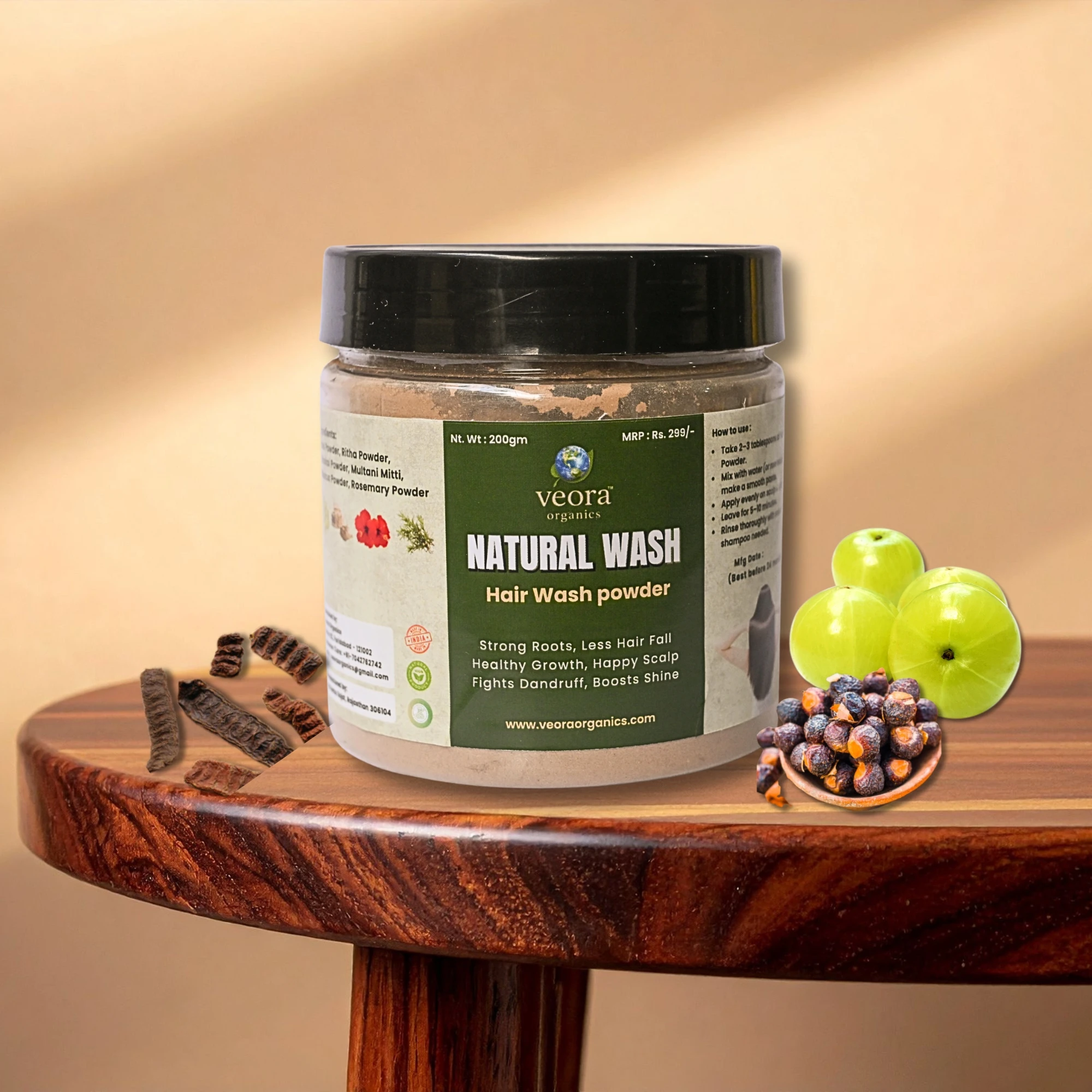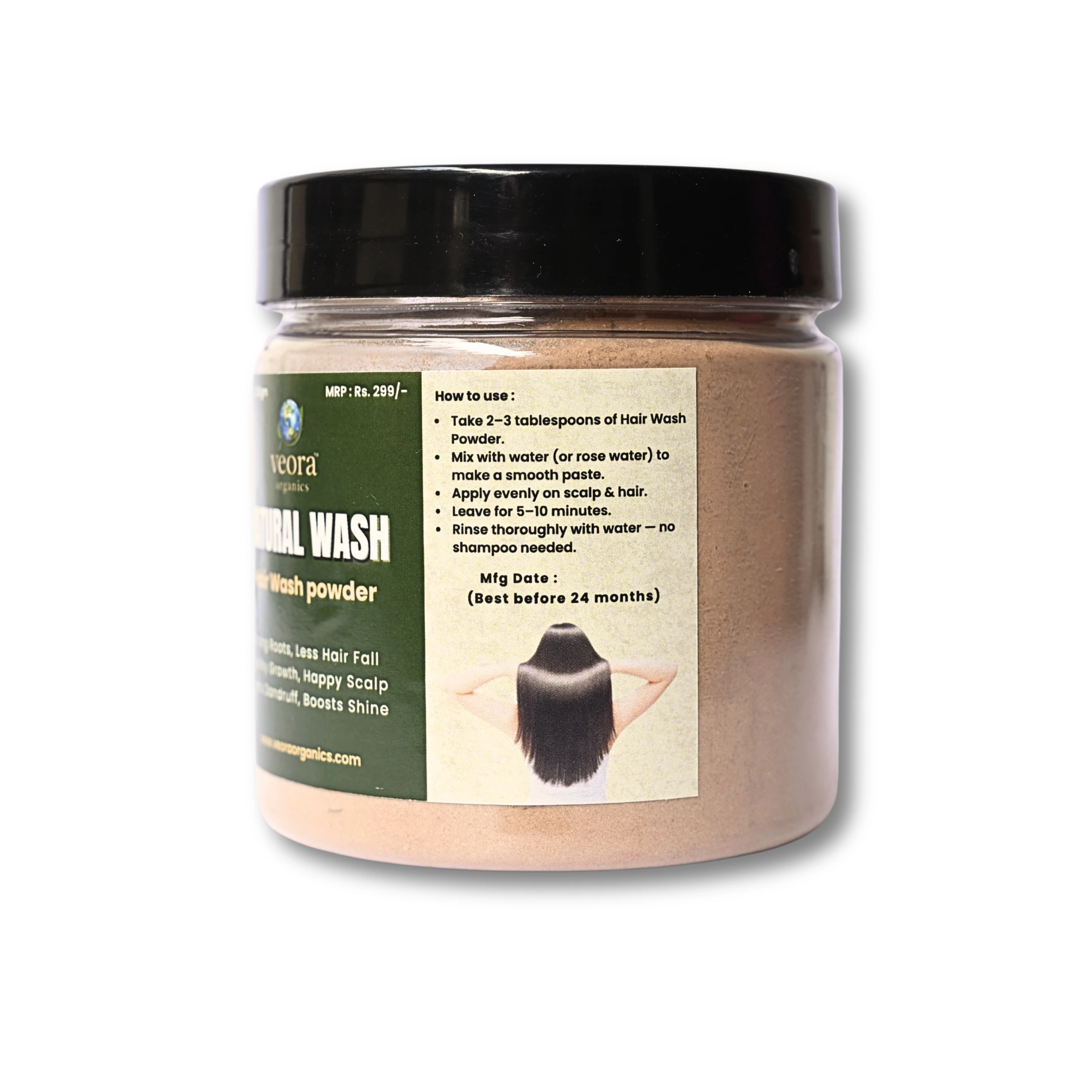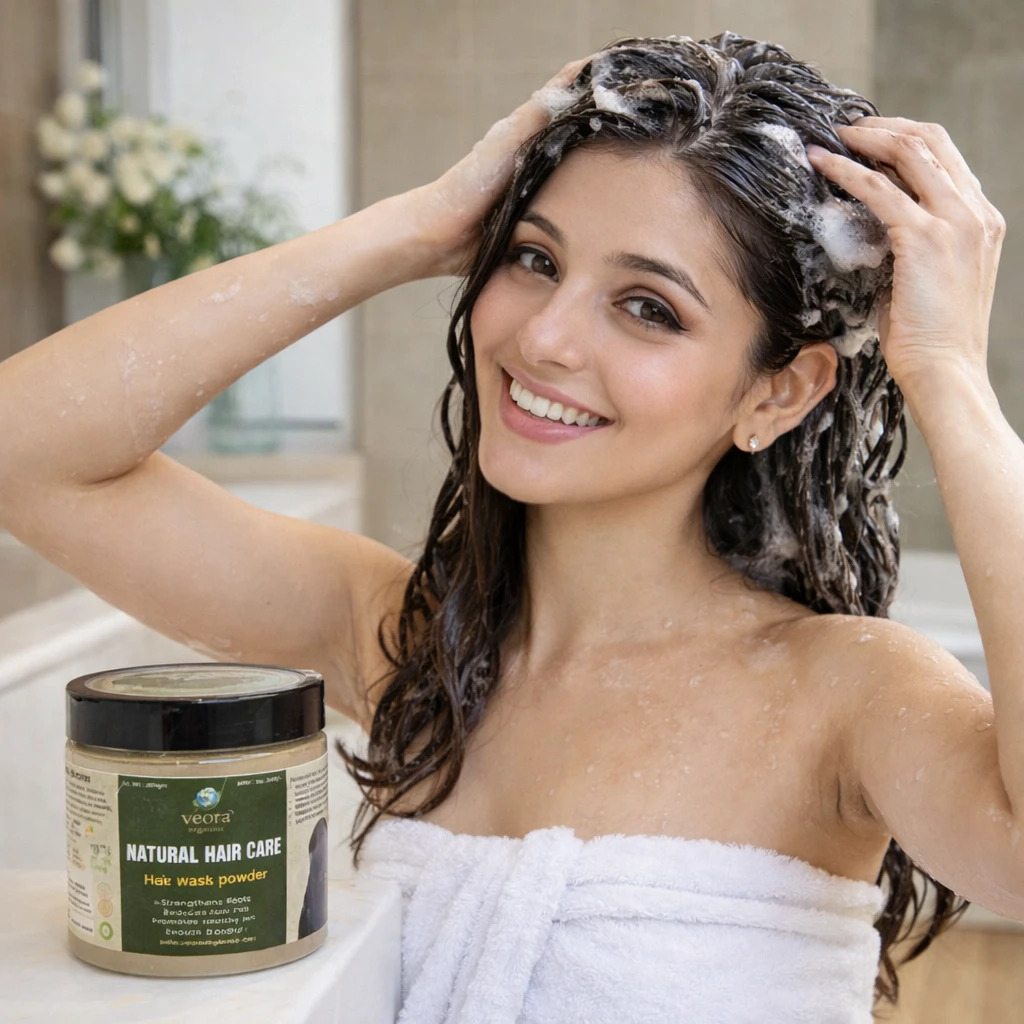 Mix 2–3 tablespoons of Veora Organics Hair Wash Powder with water (or rose water) to form a smooth paste.