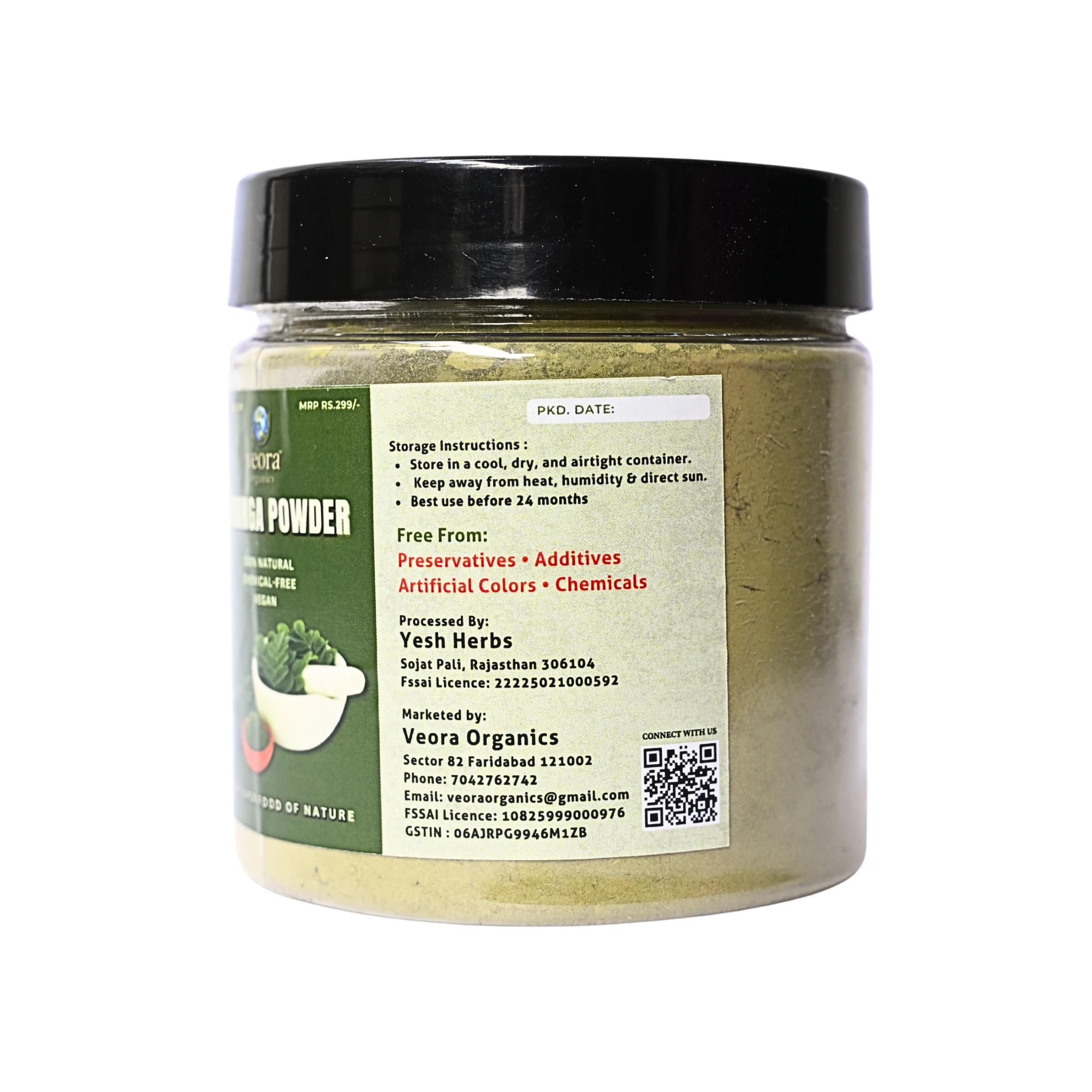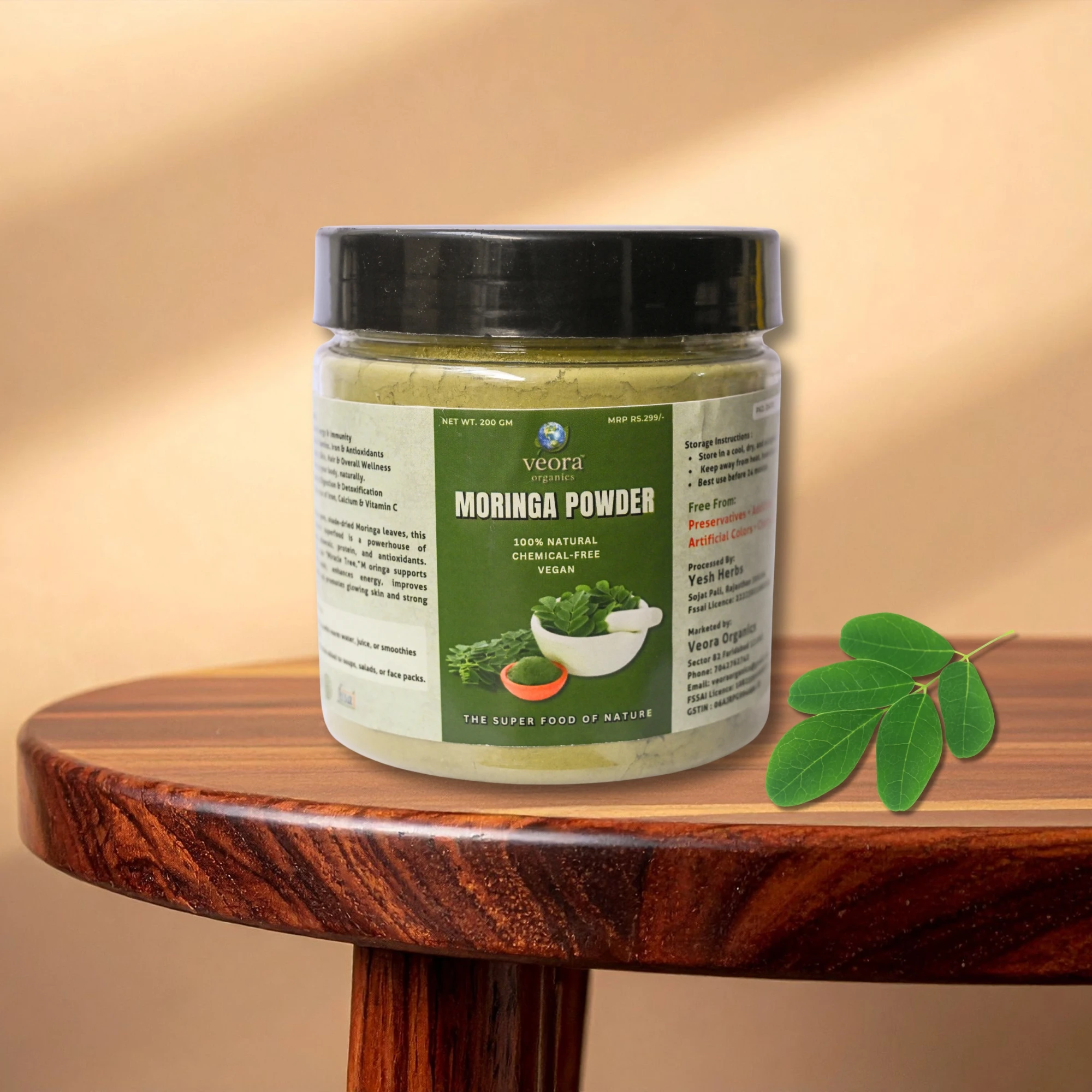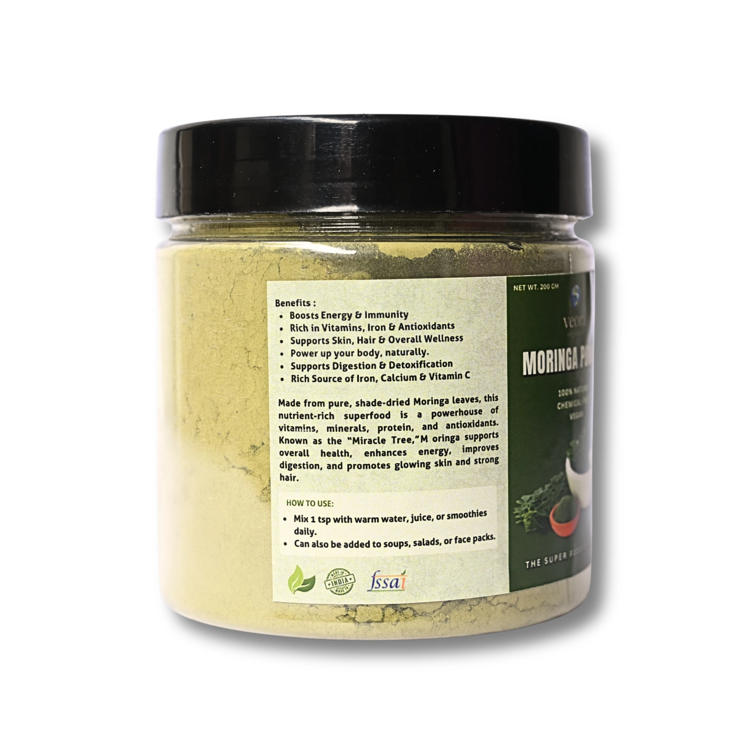 Unlock the power of nature with Veora Organics Moringa Powder 200 gms, made from 100% pure and naturally dried Moringa leaves. Known as the “Miracle Tree,” Moringa is a powerhouse of essential vitamins, minerals, and antioxidants that help boost energy, support immunity, and promote overall wellness.