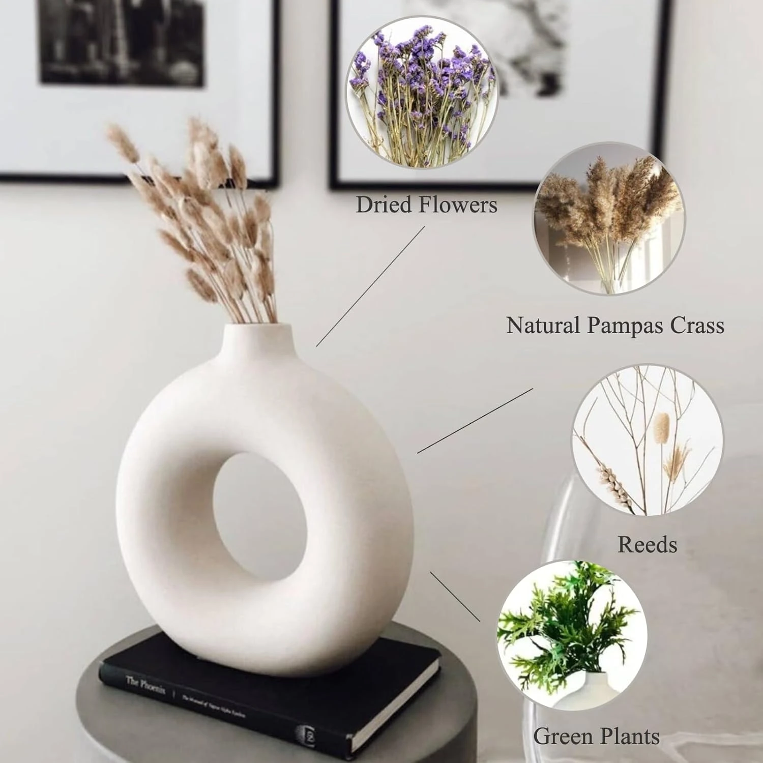 White Donut Vase Hollow Ceramic Vase for Flowers Handmade Minimalist Style Modern Home Decor Round Shape Table Party Living Room Office Bedroom (Pack of 3 S,M,L,) | Pack of 3