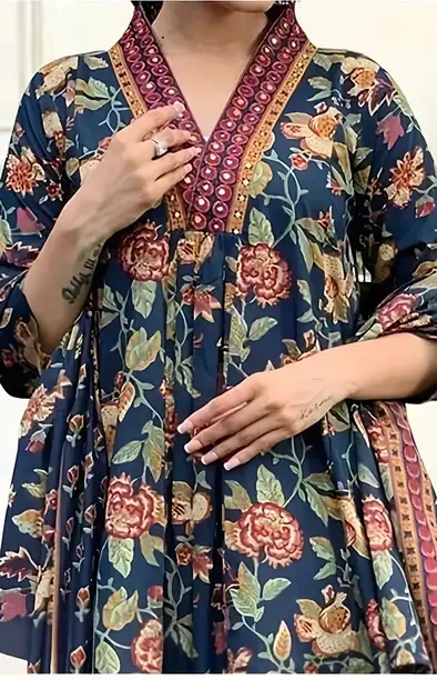 Women's Rayon Anarkali Printed Kurta with Palazzo & Dupatta