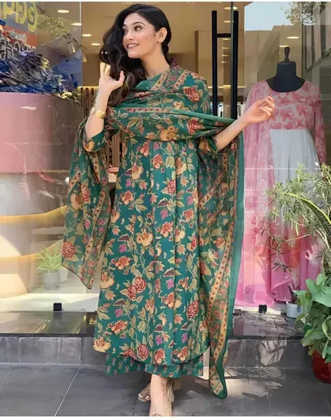 Women's Rayon Anarkali Printed Kurta with Palazzo & Dupatta