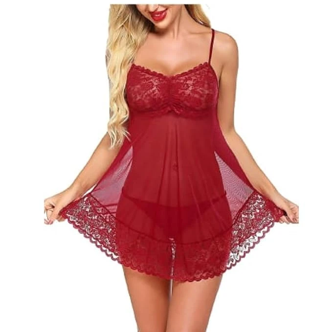 Features delicate lace cups with sheer mesh baby-doll design, halter neck styling, and decorative satin bow detail for a romantic and alluring look