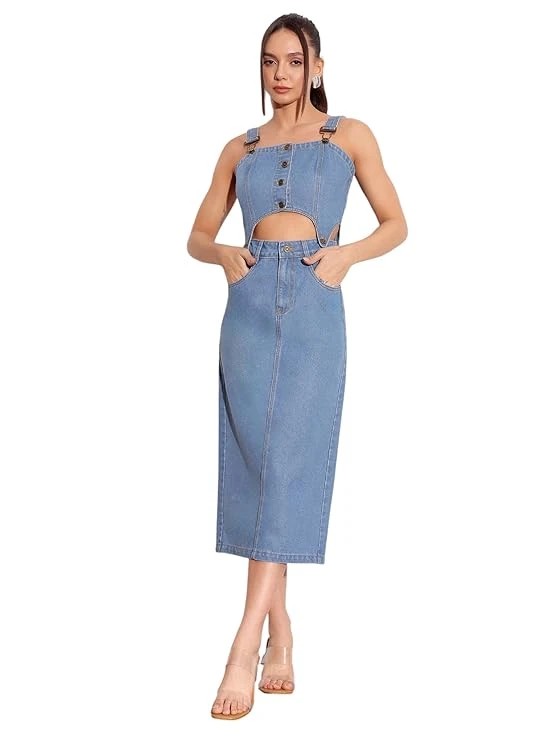 Blue Denim Pinafore Dungaree Dress for Women, Stylish Cotton midi Skirt for Office, Travel, and Casual Occasions, Available in Plus Size Size Medium